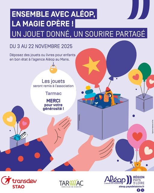 Du 3 au 22 novembre, déposez des jouets ou livres pour enfants en bon état à l'agence Aléop au Mans.
