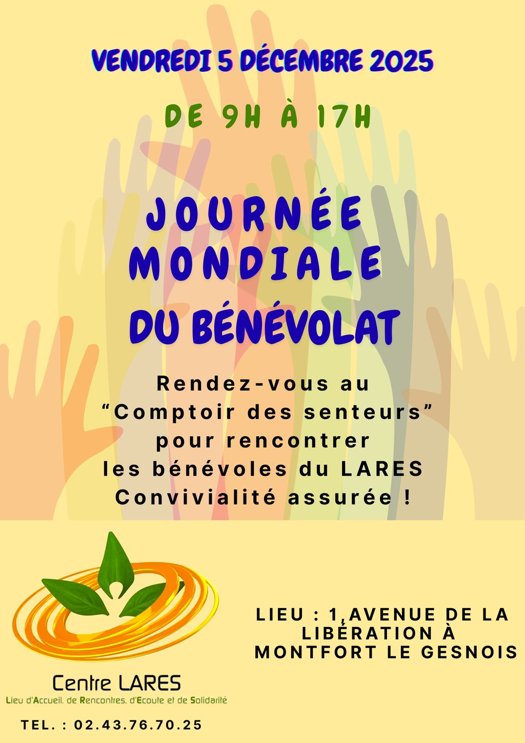 A l'occasion de la journée mondiale du bénévolat, le Centre LARES organise un "Café des Habitants" place du "Comptoir des Senteurs" à Montfort le Gesnois.