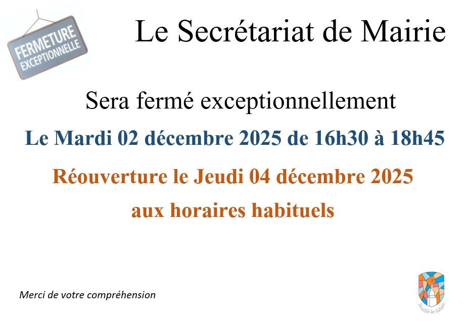 Le secrétariat de mairie sera fermé ce mardi 02 décembre de 16h30 à 18h45.