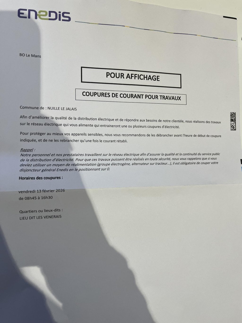 ENEDIS - COUPURES DE COURANT POUR TRAVAUX